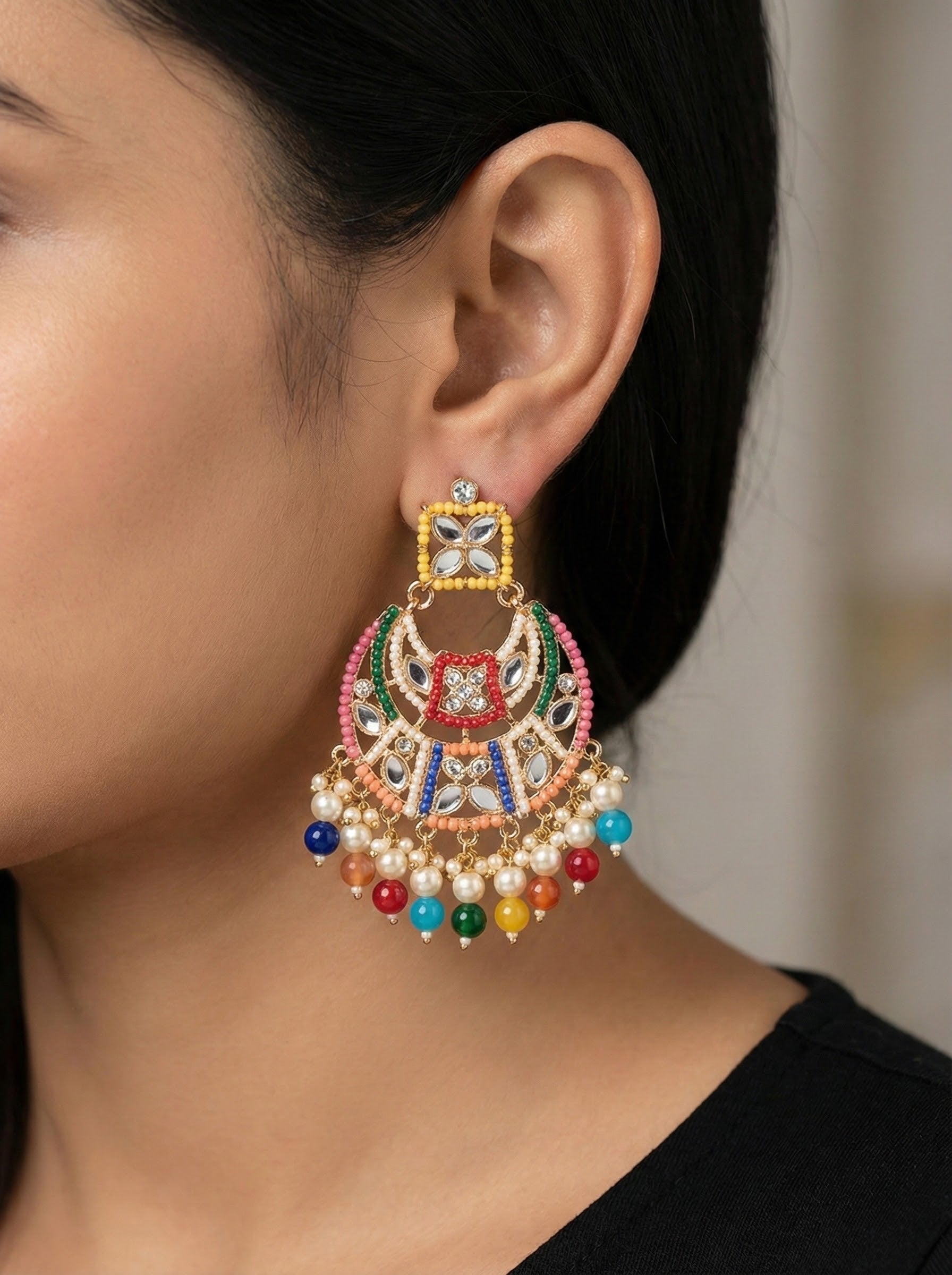Each element is thoughtfully placed to create harmony between tradition and modern styling. These jhumkas are high-impact statement pieces, ideal for festive wear, weddings, mehndi events, and cultural celebrations. Due to their unique color composition and limited sourcing, only 1–2 pairs are available — making them a true boutique exclusive.